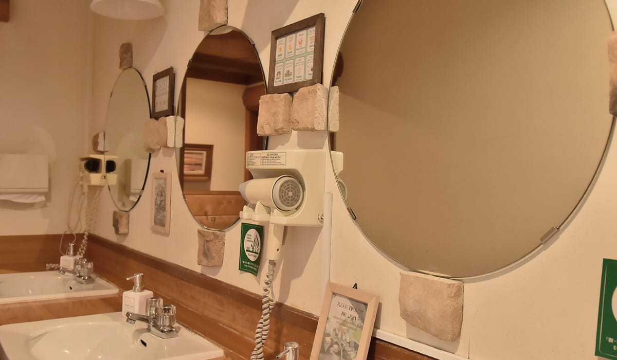 There are 2 shared bathrooms in a basement. One is with a "family Ofuro" (hot tub) and 2 showers, the other one is with 2 showers.You can lock the door and use it privately to soak in and make your worn out body warm.